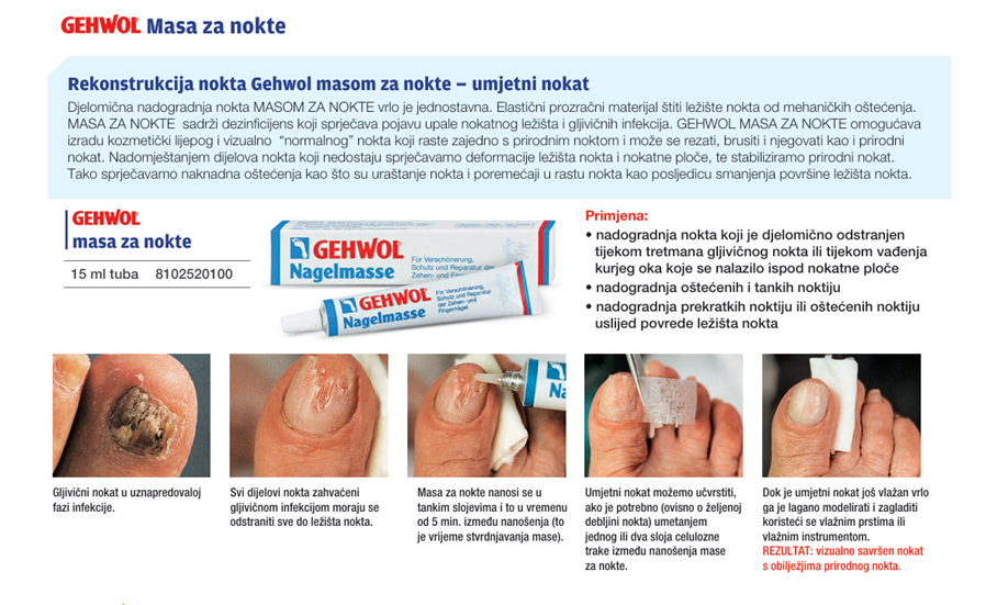 - nadogradnja prekratkih noktiju ili noktiju oštećenih uslijed povrede ležišta noktaRekonstrukcija nokta Gehwol masom vrlo je jednostavna. Elastični prozračni materijal štiti ležište nokta od mehaničkih oštećenja. Sadrži dezinficijens koji sprječava pojavu upale nokatnog ležišta i gljivičnih infekcija.